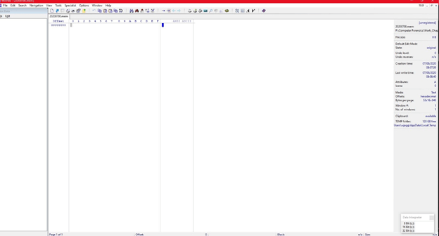 I first followed the instructions in the assignment and attempted to send the RAM data to my work folder; unfortunately, this did not work as it said there was not sufficient space. A memory file did appear, but once opening it up in WinHex, nothing showed.
