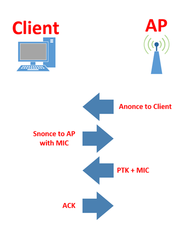 The PMK (Pairwise Master Key) is the first step involved in the 4-way handshake once the 802.1x EAP and open system authentication have finished. Next, the access point sends an Anonce or authentication Nonce to the client; once this is received, the client takes the PMK and the client’s AP’s Anonce and creates a PTK (Pairwise Transit Key). Next, the client sends its Nonce (Snonce) to the access point. Now, the AP can process and generate the same PTK (Pairwise Transit Key) as the client, thus encrypting and decrypting data sent between the two access points without ever having to transmit the PTK (Pairwise Transit Key) over the wireless network. Using the RSN (Robust Secure Network) information element, the AP verifies and validates it by sending a frame. Finally, the ACK (acknowledgment) of the EAPol key must be verified as complete. The 4-way WPA2 handshake can be captured using various tools such as Hashcat and Wireshark, and dictionary-style attacks can attempt to crack the keys used in the handshake. The weakness allows an attacker to initiate a man-in-the-middle attack while performing a Key Reinstallation Attack (KRACK) by replaying packets used in the authentication process.