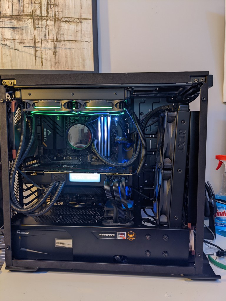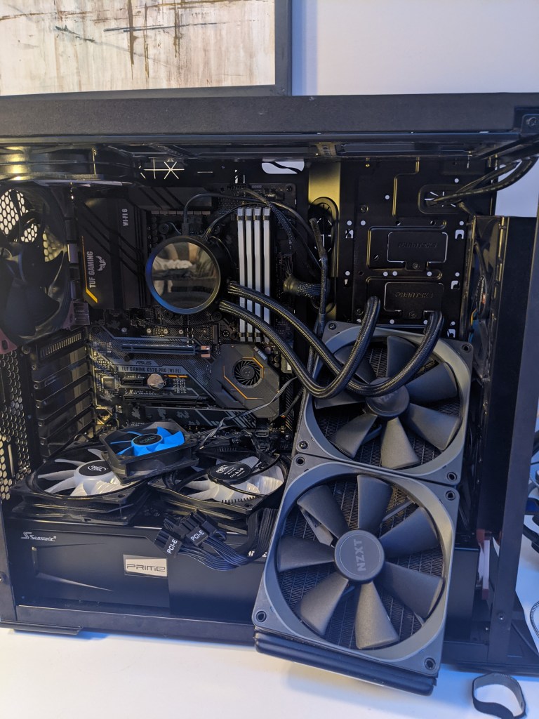 As you notice in the pictures, I had somewhat of a difficult time finding the proper placement of both my CPU and GPU AIO’s. The easiest method would have been to keep my CPU’s radiator at the top of the case and add the GPU’s radiator to the front; however, the GPU’s radiator produces significantly more heat than the CPU’s. So, I had to switch everything around and now have the GPU’s radiator blowing hot air outside my case on the top and the CPU’s radiator sucking cold air via the front of the case. I am still not satisfied with the positions of all the hoses as I can get some intense ‘whooshing’ sounds that make me believe there is air trapped in the system, but I am still working on it. Also, the CPU radiator didn’t want to fit at the front properly, so I had to remove a piece of the case and tilt the radiator at somewhat of an angle to install it.