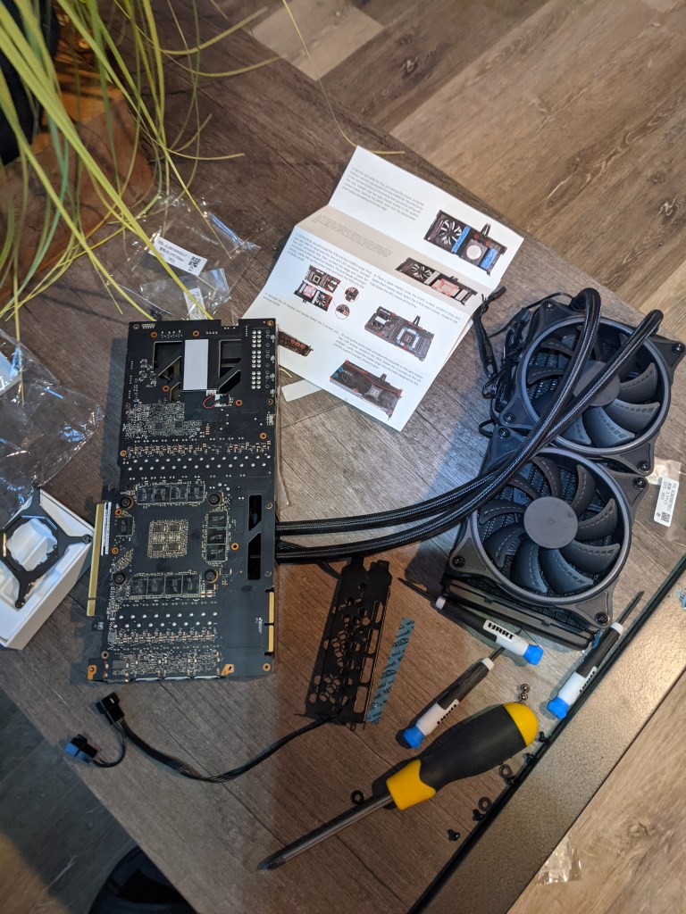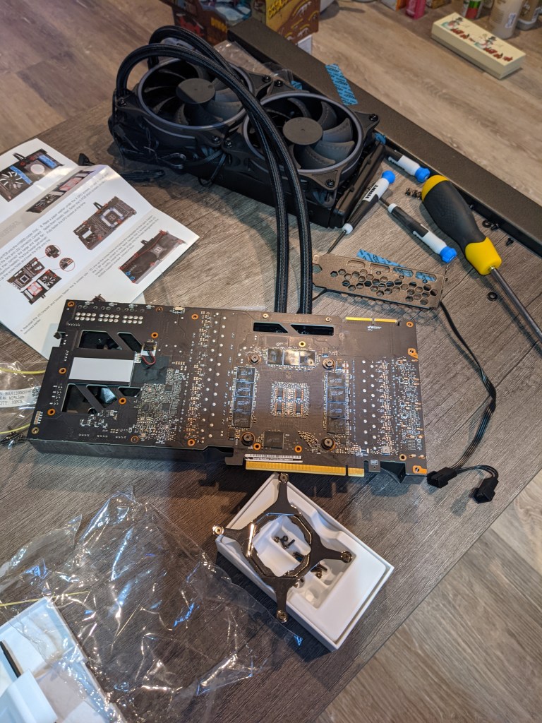 From researching other user cases, I saw that blocking the openings in the hybrid kit can drop VRAM temps as well; to better explain this, if you look at the top of the card, you can see straight through to the hybrid kit’s bottom right fan, thus wasting any cold air that could have made it to the VRAM on the top backplate. There are also some gaps in the power connectors, LED lights, etc. I initially attempted to close these gaps by merely adding some carefully cut cardboard pieces but didn’t like the idea of having such an odd foreign object in a $2k+ device. In the end, I just buttoned everything up as it showed in the manual.