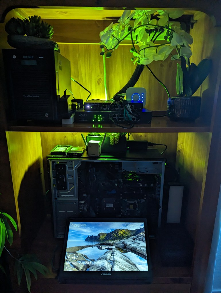 In my office, I am still pricing out a large enclosed server rack, which I would like to place near the window to allow for some of the hot air to be exhausted outside. I am using a repurposed cabinet for the time being, which actually works quite well. The modem connects to a TP-Link 16-port switch, which then routes to a NETGEAR Nighthawk MR80 Mesh Wi-Fi system with a satellite on each of our 3 floors (currently not hardwired, but it is on my do list).