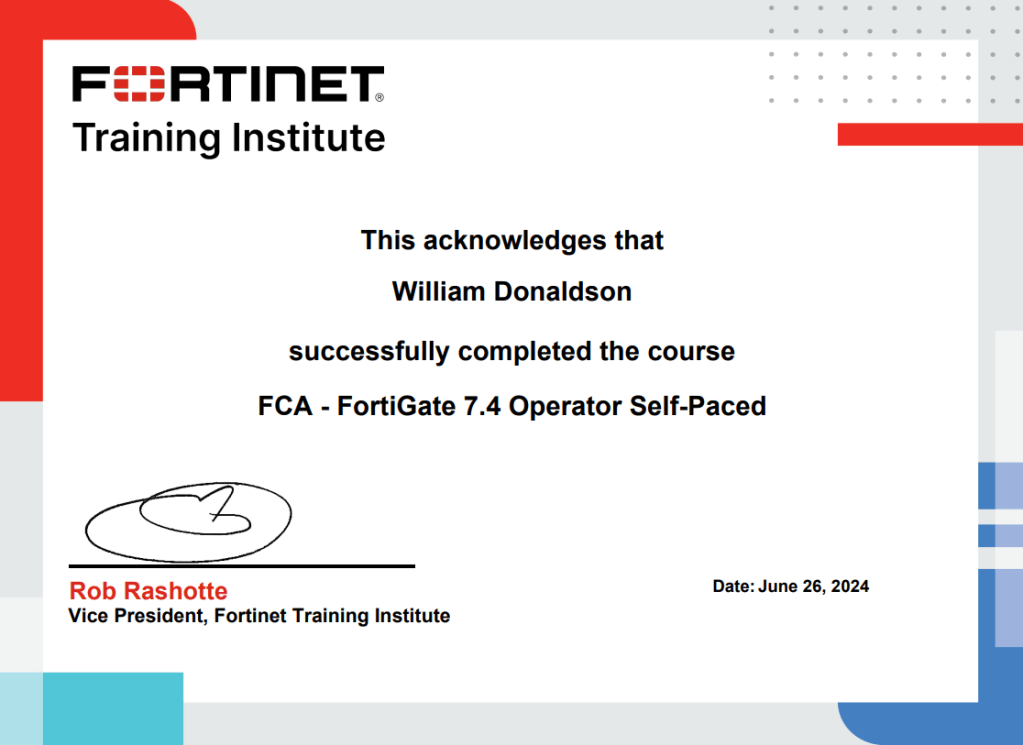 Random Thoughts New Certificates: Fortinet FCA – FortiGate 7.4 Operator and Fortinet Certified Associate in Cybersecurity By William Donaldson on June 26, 2024 • ( Leave a comment ) Two more credentials/courses completed. On to the next! Share this: Click to share on X (Opens in new window) X Click to share on Facebook (Opens in new window) Facebook Like Loading... Categories: Random Thoughts
