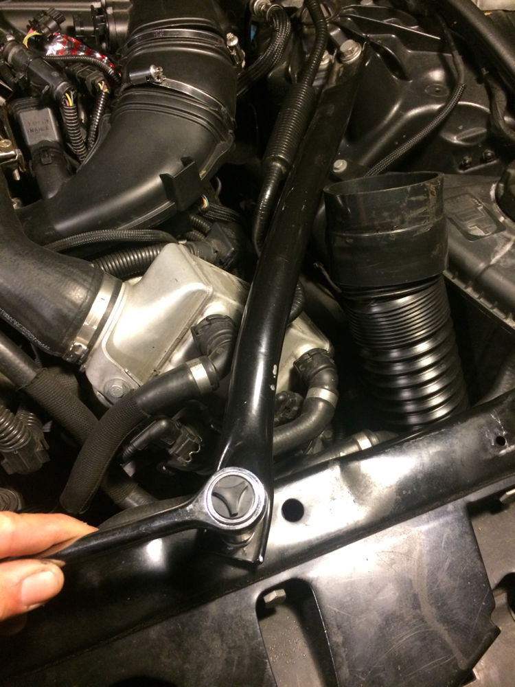 To begin, you’ll need to remove the stock intake system. Start by removing the crossbars located above the intake tubes. Use a 5/8″ or 15mm socket to remove the bolts securing these bars.