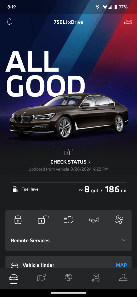 I have been on the fence about whether to use the ‘My BMW’ app from BMW for my 750i since I was pretty sure it was a paid service and due to many of the features and abilities already available to me by simply using my display key. However, I was glad they are giving it for free now (at least in my case), so I figured I would share my thoughts on the app.