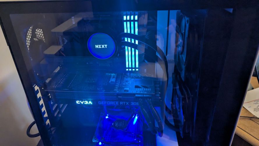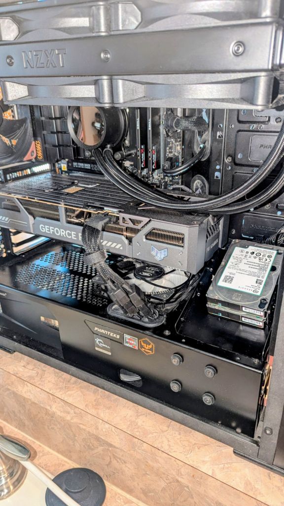 Once I got everything installed, I spent some time trying to get my old EVGA 3090FTW to work after it died in a previous build, but I was unable to. Gladly, I had a very old GPU to use to just get video working, as my CPU didn’t have this capability. For Fallout VR, I figured a 3080 would suffice, so I managed to stuff that in there as well. For storage, I added a Samsung 980 1TB NVME boot drive, a Samsung 1TB 970 NVME drive, and a 2TB Samsung SSD.